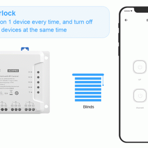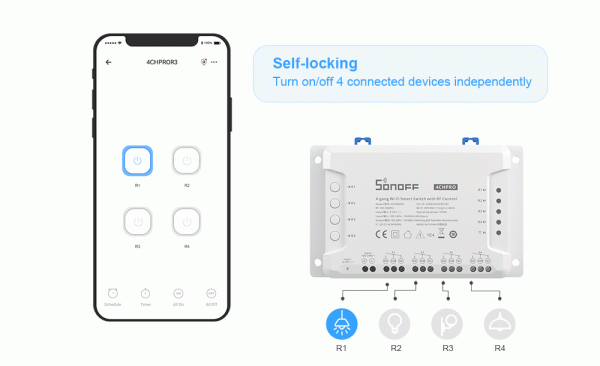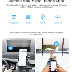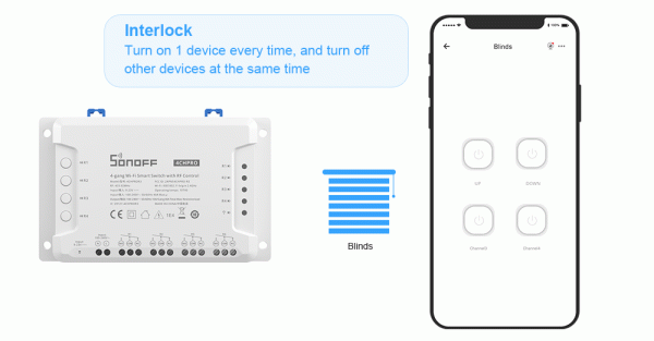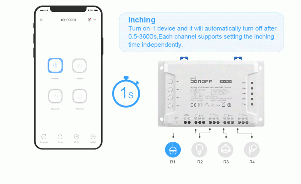 - 3 working modes can be set on eWeLink APP: self-locking mode to turn on/off 4 devices separately, interlock mode to turn on 1 device and turn off the rest simultaneously, and inching mode to turn on 1 device and automatically turn it off after a given time (0.5-3600s).