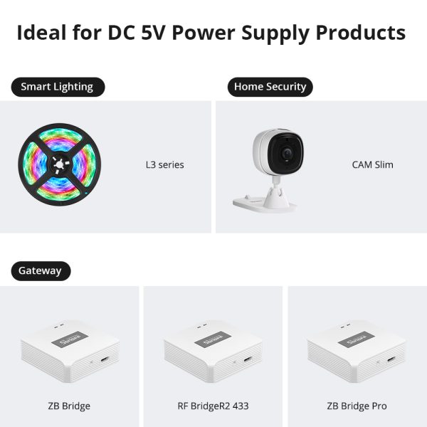 • Compatible with DC 5V power supply products such as SONOFF iHost, SONOFF L3 Pro Strip Light, L3 strip lights, Cam Slim, RF BridgeR2 433, ZB Bridge Pro, and more