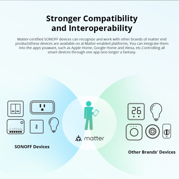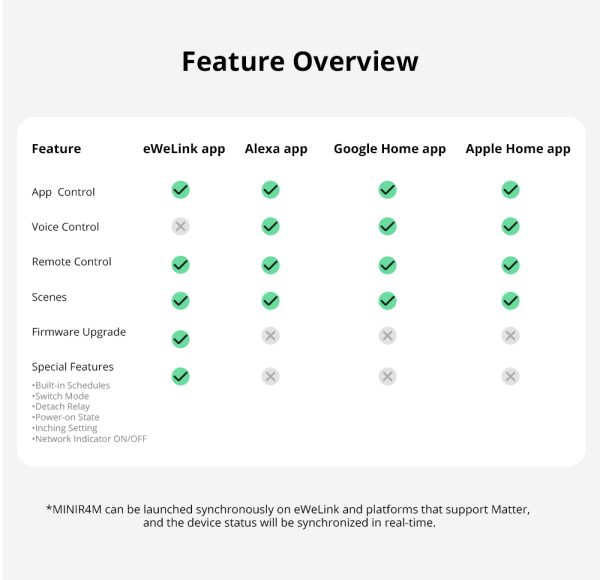 The SONOFF MINIR4M is a versatile and compact smart switch that is Matter-certified, making it an ideal choice for integrating into any Matter-enabled smart home platform. With MINIR4M, you can easily control all your smart devices through a unified app, supporting popular platforms like Alexa, Apple Home, Google Home, and more.