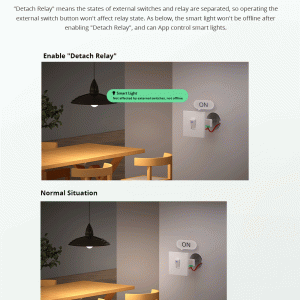 Detach Relay Mode: The innovative “detach relay” mode allows the external switch button to operate independently without affecting the relay state. This is perfect for scenarios where you want to control devices separately, providing more flexibility in your smart home setup.