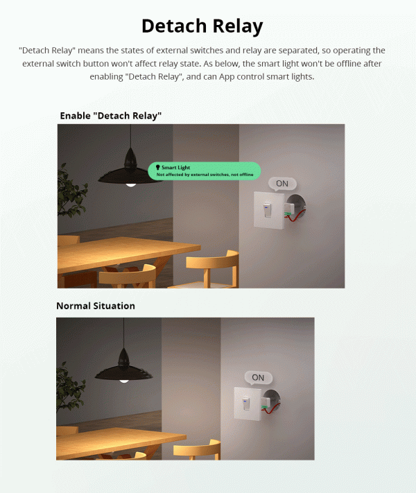 Detach Relay Mode: With “detach relay” mode, the states of external switches and relays are separated. This means that even when you operate the external switch button, the relay state remains unaffected, allowing your smart light to stay connected and controllable via the app even if the switch is turned off.