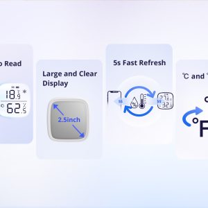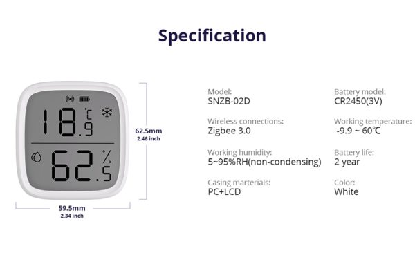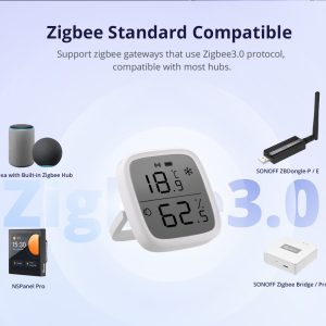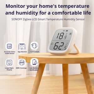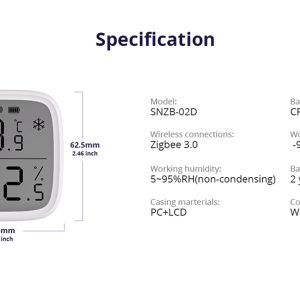 SONOFF SNZB-02D is a Zigbee temperature and humidity sensor with 2.5 inch LCD display with large bold numbers that can work with Zigbee 3.0 gateways like SONOFF Zigbee Bridge Pro, SONOFF NSPanel Pro, SONOFF ZBDongle-P/E, Alexa with Built-in Zigbee Hub,etc to monitor your home’s temperature and humidity for a comfortable life, and there are icons to indicate Hot/Cold/Dry/Wet air conditions, reminding you to adjust your humidifier or dehumidifier accordingly to achieve optimal comfort, also power icons for you to know the current power usage, the high accuracy built-in swiss-made sensor ensures accurate measurement of room temperature and humidity, the temperature is accurate up to ±0.2℃ while the humidity is ±2%RH, data is updated every 5s, always gives you the latest changes in the environment.