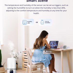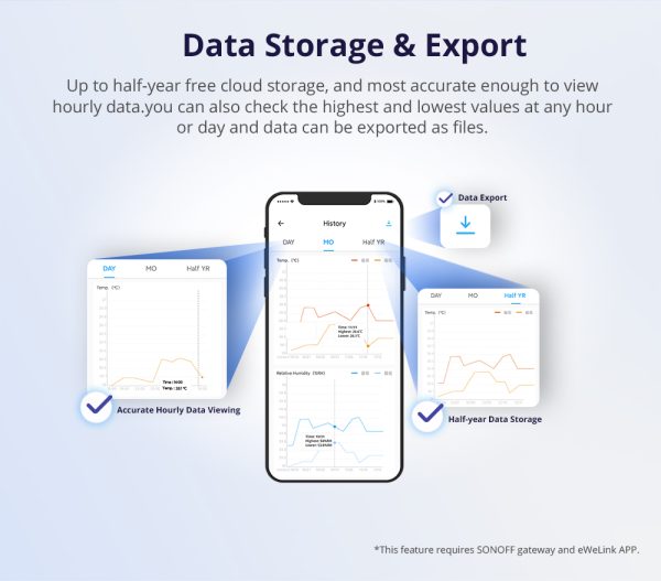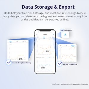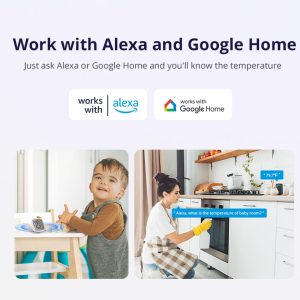 The SNZB-02D sensor supports APP monitoring, you can not only check the current temperature & humidity on the LCD display, but also track the real-time and historic temperature or humidity data via the app on your phone, with up to 120m/400ft coverage (no obstructions and ideal conditions), you can check the latest data at any time, and once the temperature or humidity exceeds the preset range, you will receive an instant alert from the APP, you can view the temperature and humidity date by day, month, and year, the half-year curve graphs provide a clear data-changing track. you can export data as .CSV files, the temperature and humidity of the sensor can be set as triggers, such as setting the humidifier to turn on when the humidity is less than 40%, adjusting to the comfort temperature and humidity at any time for your health, it works with Alexa and Google Home, just ask Alexa or Google Home and you’ll know the temperature or humidity.
