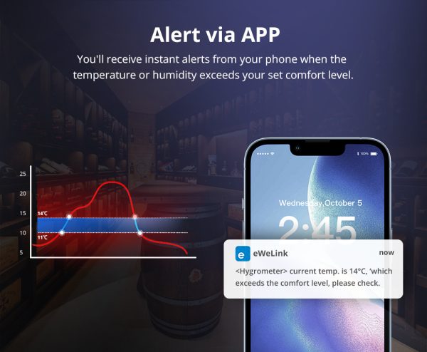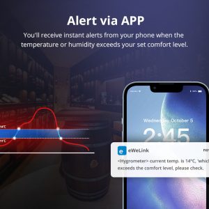 App Notifications: Instantly receive alerts on your phone when temperature or humidity goes beyond your set comfort levels.