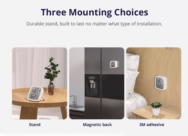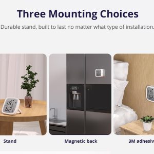 The sensor supports 3 mounting methods – tabletop atand / magnetic back / 3M adhesive, just place the sensor anywhere you wish such as living room, baby room, kitchen, greenhouse, guitar room, reptiles terrarium, humidor, cellar or incubator to monitor temperature and humidity remotely.