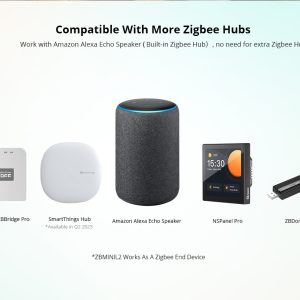 The ZBMINIL2 requires a Zigbee Hub for operation. It is compatible with a range of Zigbee hubs that support the Zigbee 3.0 protocol.
