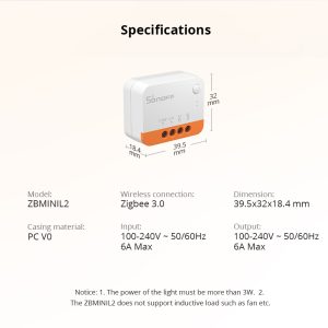 The SONOFF ZBMINIL2 is a compact Zigbee 3.0 smart switch designed to upgrade traditional switches with smart automation features. Its small size, versatile compatibility, and smart functionalities make it the perfect addition to your smart home system.