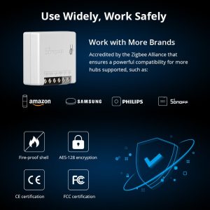 SONOFF ZBMINI is a Zigbee-enabled two-way smart switch that is compatible with different hubs, including SONOFF ZBBridge Pro, Amazon Hub, Samsung SmartThings Hub and Philips Hue Hub. The Zigbee3.0 protocol gets ZBMINI and Zigbee bridge Pro to be paired in a quick way. ZBMINI is safer to use in you home that is promised by the fire-proof and flame-retardant shell. Additionally, AES-128 encryption ensures the safety is extended to data device privacy, no worry about privacy disclosure of your device. It can be as a Zigbee router to help transmit the Zigbee signal to ensure a stable connection when multiple Zigbee devices are used for your home. If you are keen on two-way control, you can connect a Single Pole Double Throw switch as the external connection to expand the control way.