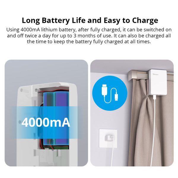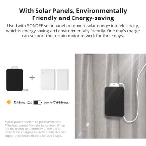 The SONOFF Zigbee Curtain Motor allows you to convert your existing curtains into smart curtains with ease, without requiring any modifications or tools. It offers a powerful motor that can smoothly pull curtains weighing up to 8kg. Designed for versatility, it supports both single-side and double-side opening curtains. The motor can be controlled through the eWeLink app, allowing you to set schedules, create smart scenes, and even integrate with voice assistants for hands-free operation. Featuring manual pull-to-start functionality, the motor can automatically open or pause curtains when gently pulled. With a 4000mAh rechargeable battery, it provides up to 3 months of regular use on a single charge.